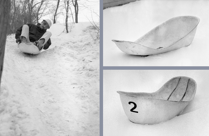 Im Rahmen eines Auftrags der BASF Ludiwgshafen nach Anwendungen für Polyester zu forschen, lag es in der damals von langen Wintern geprägten Lage der Hochschule für Gestaltung an einem der Ausläufer der schwäbischen Alb, dem Kuhberg nahe, einen Bob aus Kunststoff zu versuchen. Das Material GFK erwies sich dafür aber als zu wenig elastisch.