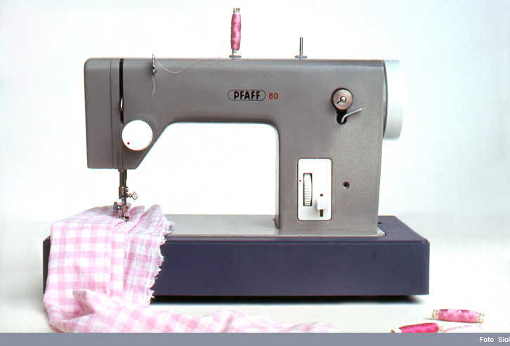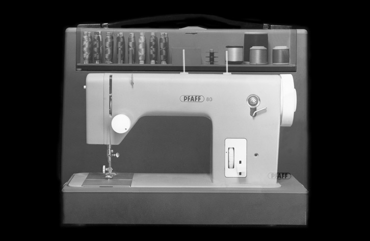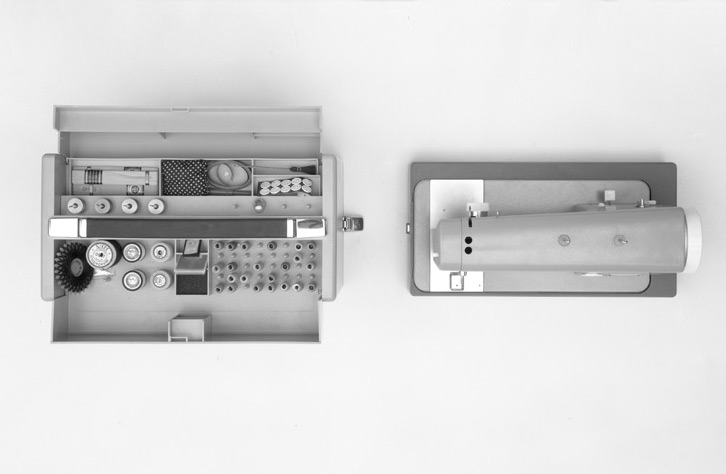 Haushaltsnähmaschine für die Pfaff AG, Kaiserslautern.  Ein Auftrag an Hans Gugelot, Dozent an der Hochschule für Gestaltung Ulm, der seine beiden Assistenten am Entwurf beteiligte. Hauptkörper aus Grauguss, der gebrauchsmustergeschützte Koffer in Kunststoff.