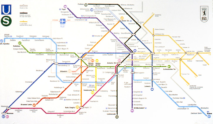 Neu daran ist vorallem die Codierung der Haltestationen. Dies geschah vorher üblicherweise durch schwarze Punkte, Striche oder Kreise. Da diese Pläne auf engstem Raum stets zwangsläufig überladen sind von schwarz gedruckten Stationsnamen und sonstigen unvermeidlichen Informationen, entschied sich LD umgekehrt für weiße Unterbrechungen der meist farbigen Linien in Form von Strichen oder Kreisen. Bei gleicher Wirkung kommt es dabei zu einer erheblichen optischen Entlastung der Pläne .