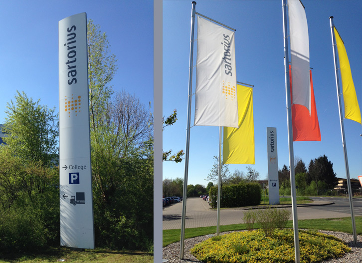 Interne wandangebrachte Beschilderungen der Arbeitsräume des Konzerns und Stelenelemente im Freien mit besonderer Akzentuierung wichtiger Eingänge durch Fahnenpulks, die die neue, gelbe Hausfarbe mit affinen Farben verstärkte.