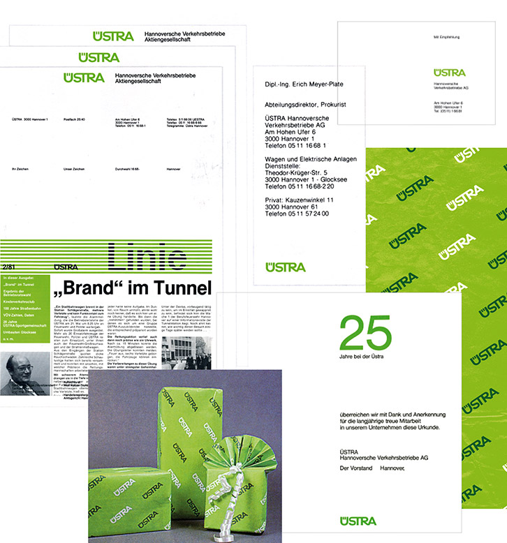 Das neue Grün als durchgängige Unternehmensfarbe Umkehr der Firmierung: Üstra Hannoversche Verkehrsbetriebe statt Hannoversche Verkehrsbetriebe ÜSTRA ein neues Namenslogo.