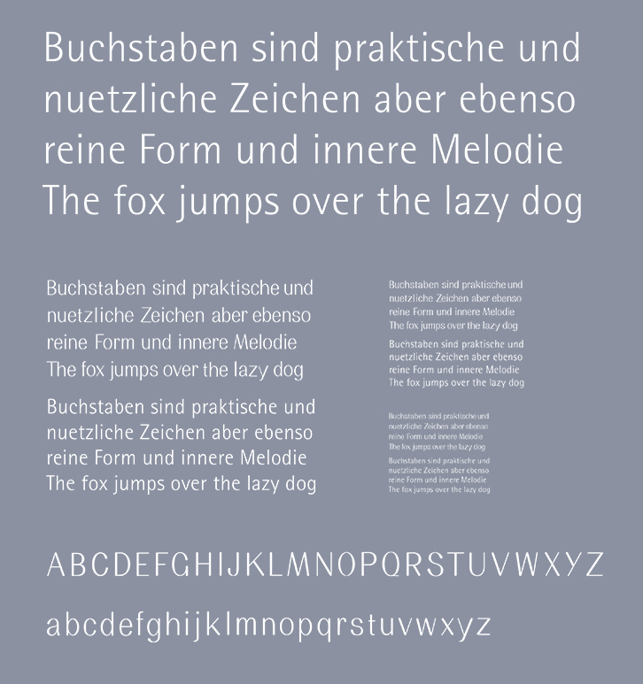 Ein Entwurf mit vier Varianten für PCs und Macs. Hier wird eine Schriftenfamilie von sehr sachlicher Serifenlosigkeit, also Groteskanmutung, bis zur differenzierten Serifenschrift auf eine neue Art interpretiert.