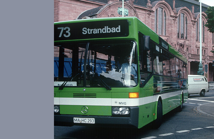 Der hier anschließend gezeigte grüne Bus von Daimler Benz wurde in der für die Verkehrsbetriebe Mannheim von LD entworfenen Farbgebung lackiert. Ähnliches gilt für den anschließend gezeigten Neoplan-Bus.