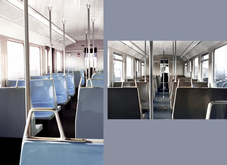 Einführung des GFK für die Sitze. Einführung der Sitzergonometrie in das Fahrzeugdesign des öffentlichen Massentransports: 107° Sitzwinkel zur Vermeidung einer gekrümmten Sitzhaltung anstelle der üblichen 90°.